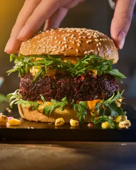 Homemade veggie burgers are an exciting new take on a classic beef burger. Enjoy tasty patties made from beetroots, black beans, mushrooms, and quinoa, nestled between soft buns with chipotle butter and sweet corn salsa.