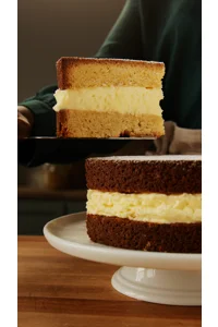 Verdeel het mengsel gelijkmatig over de twee bakvormen. Bak 25 tot 30 minuten of totdat de prikker, wanneer je deze in het midden van de taart steekt, er schoon uitkomt.